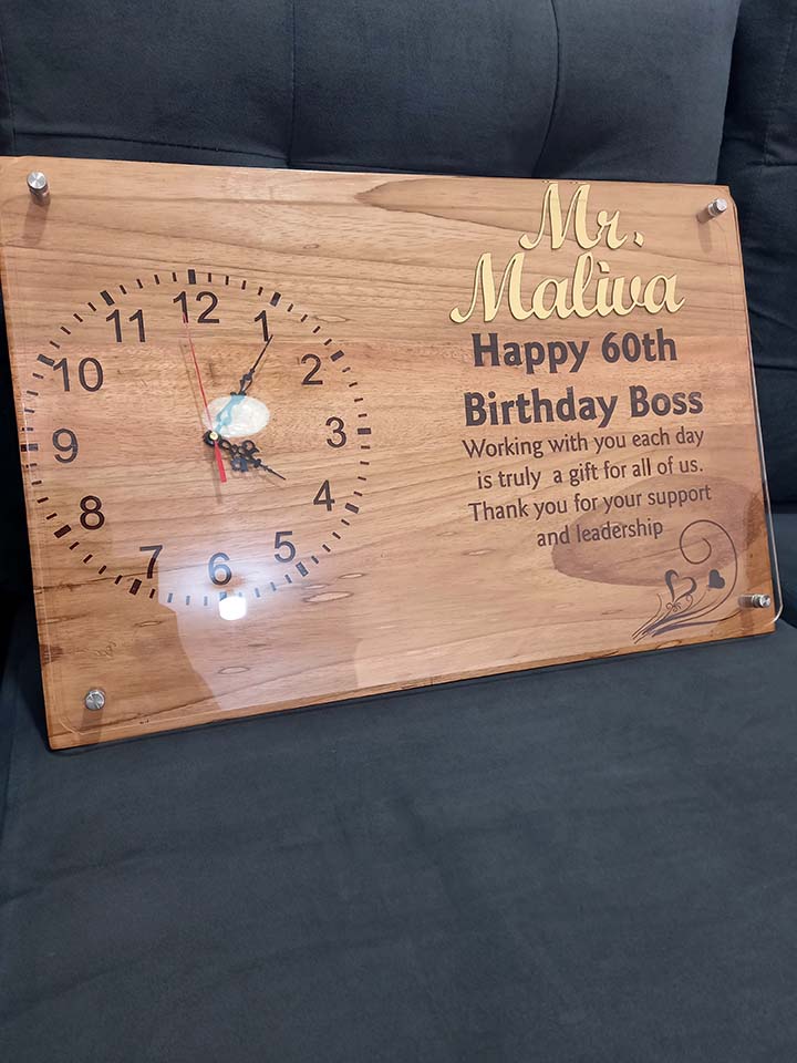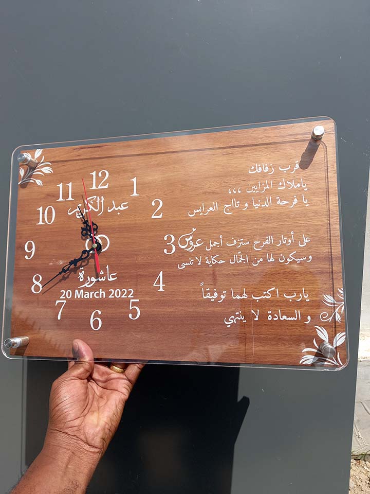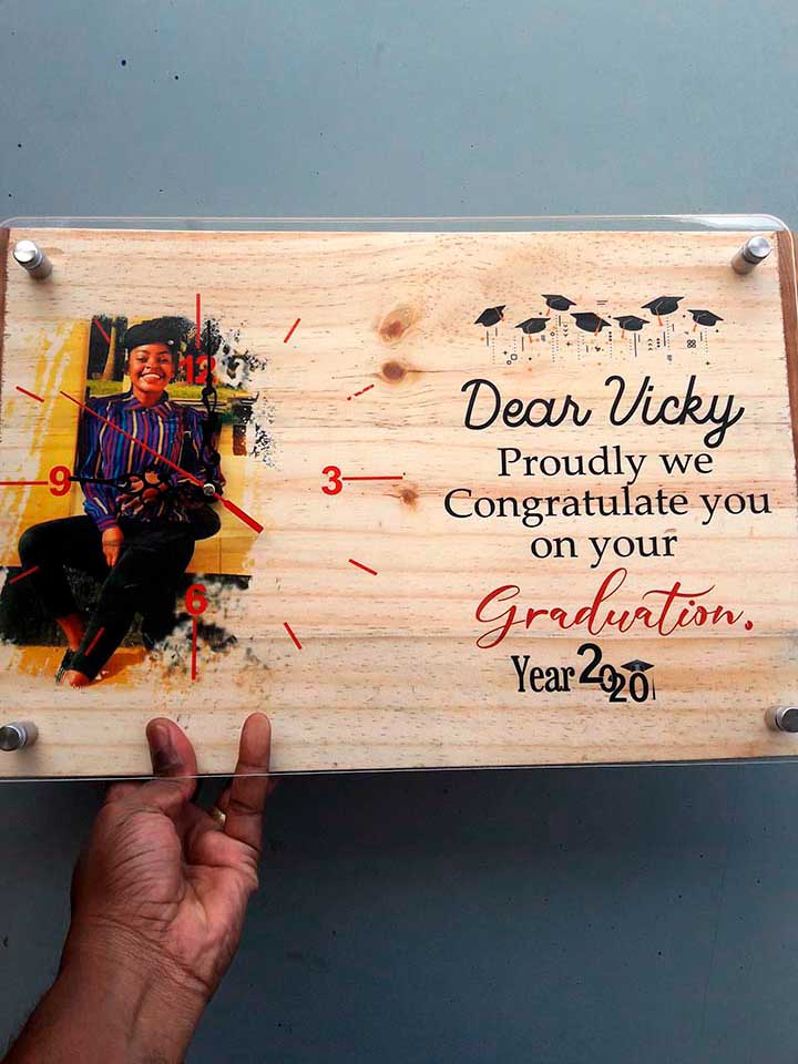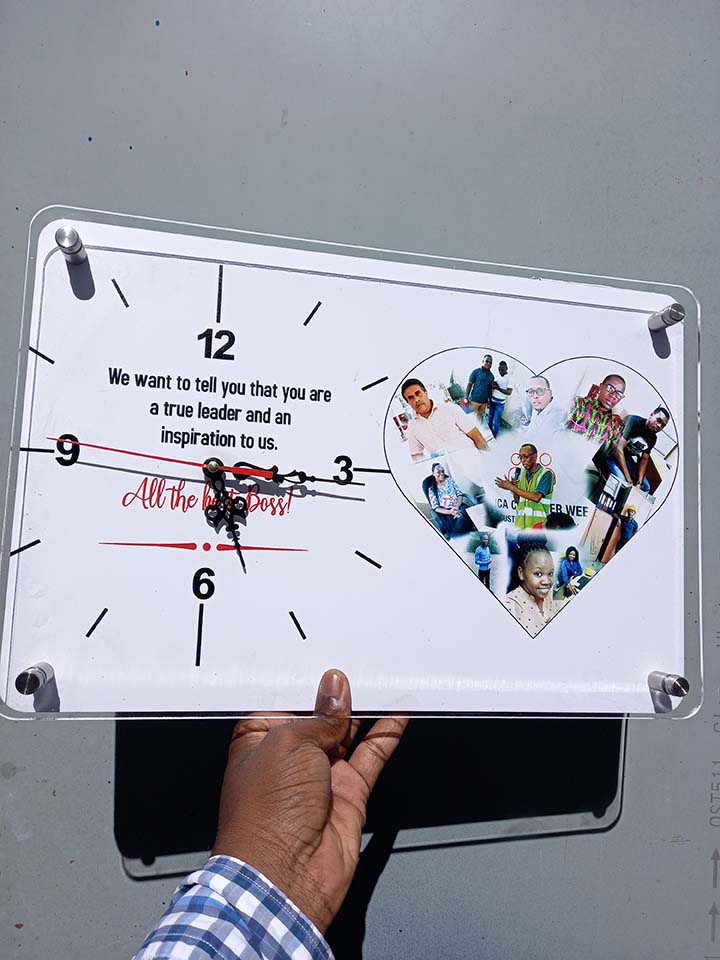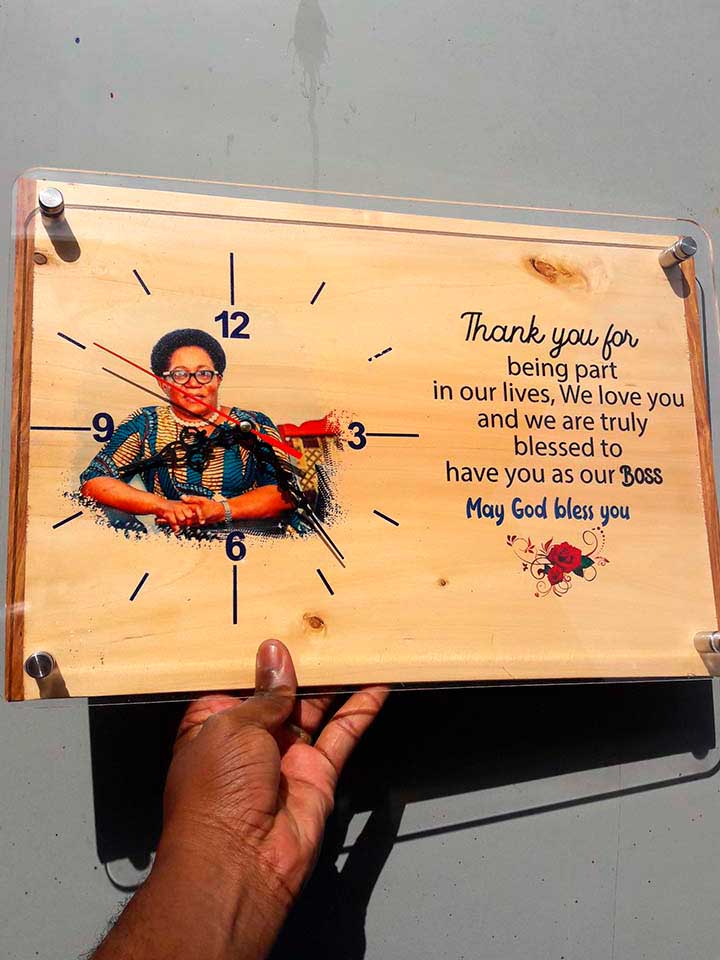 Wall Clock A3 Whiteboard / Wooden boardTZS 75,000 Best gift idea for family, friends, couples, corporates, and events DETAILS Wooden board design or Whiteboard design Customized text with or without the picture Category: Clock Tags: A3, clock, kwanzaprints, wall, whiteboard, wood Related products Add to cart Round Wall Clock TZS 55,000 Add to cart Wall Clock A4 Whiteboard / Wooden board TZS 55,000 Add to cart Wooden Plaque without picture TZS 60,000 Add to cart Round Plaque TZS 35,000